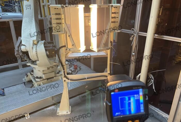 在待折彎的熱塑性預(yù)浸料板上進(jìn)行紅外線快速預(yù)熱軟化,雙面加熱,以達(dá)到折彎所需工藝要求。利用線型聚焦加熱器(加熱器聚集成一條高溫加熱線)的低能耗,高光強(qiáng),穿透力強(qiáng),控制簡(jiǎn)單等特點(diǎn),通過上下布置,快速精準(zhǔn)軟化所需的狹長(zhǎng)區(qū)域,尤其帶有厚度的預(yù)浸料折彎加工。
